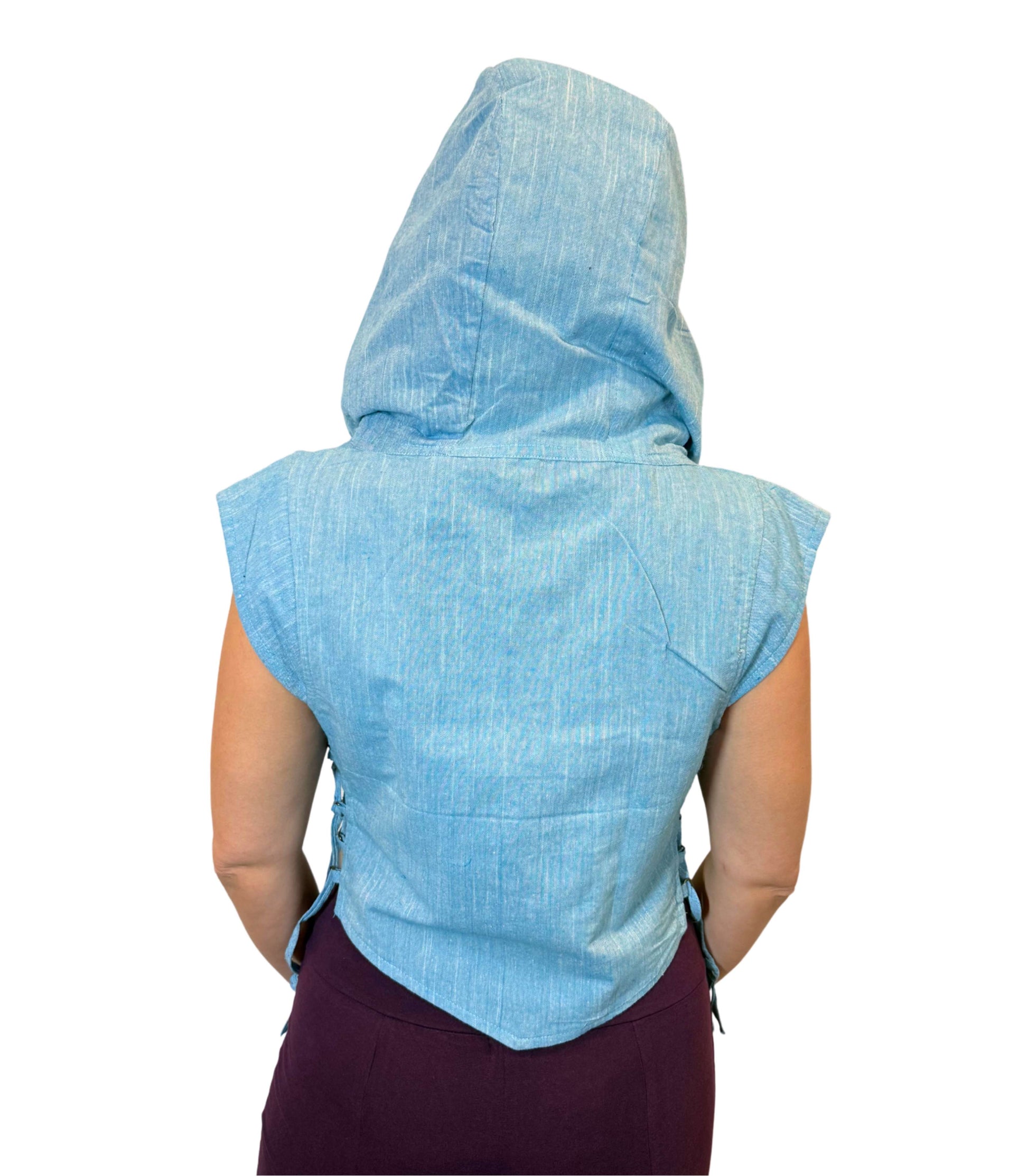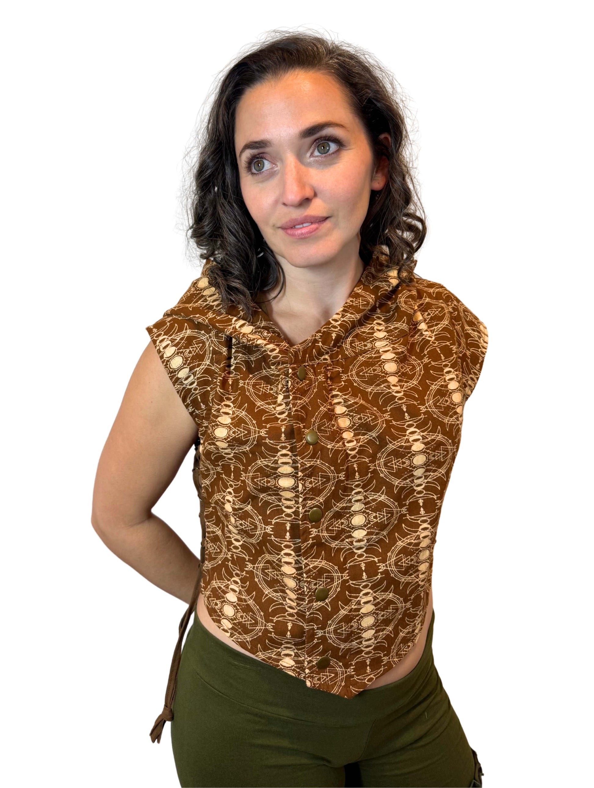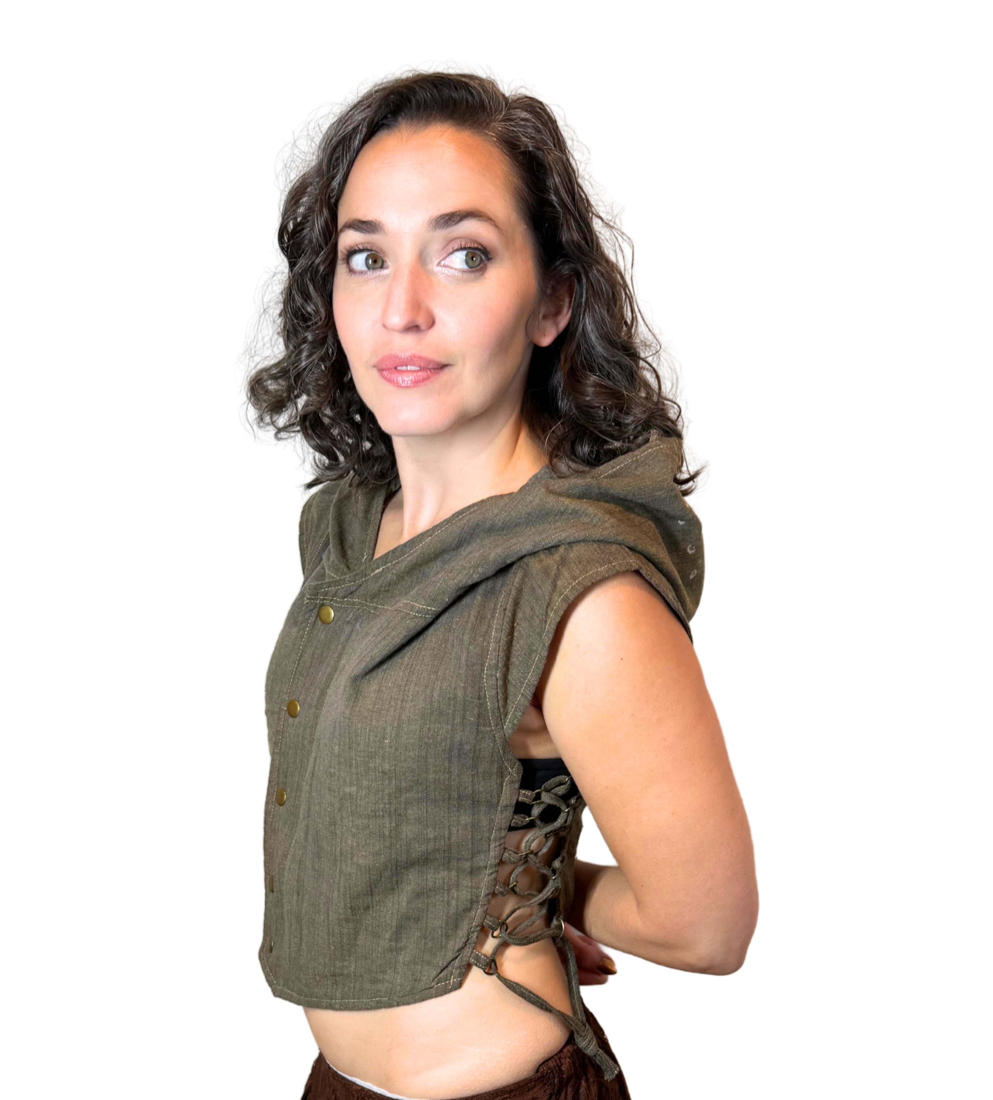 Androgynous Cropped Vest with Hood – Cotton Loop Net, Brass Snaps, and Zipper – Stylish, Unique, and Recycled