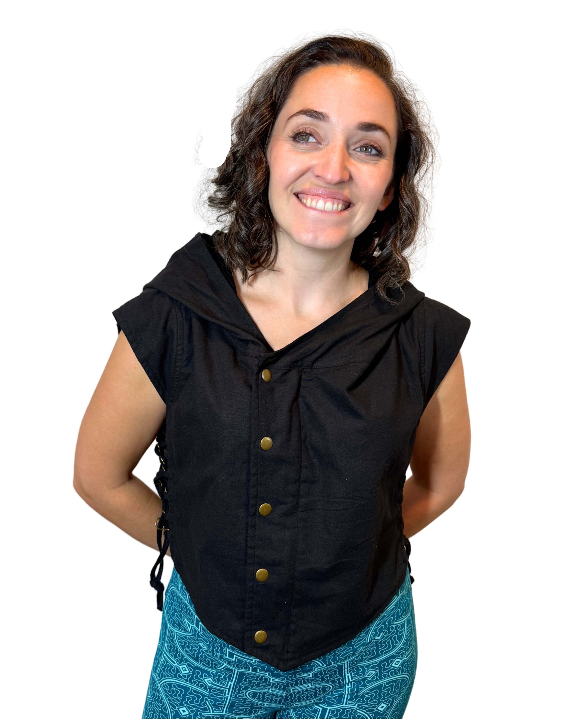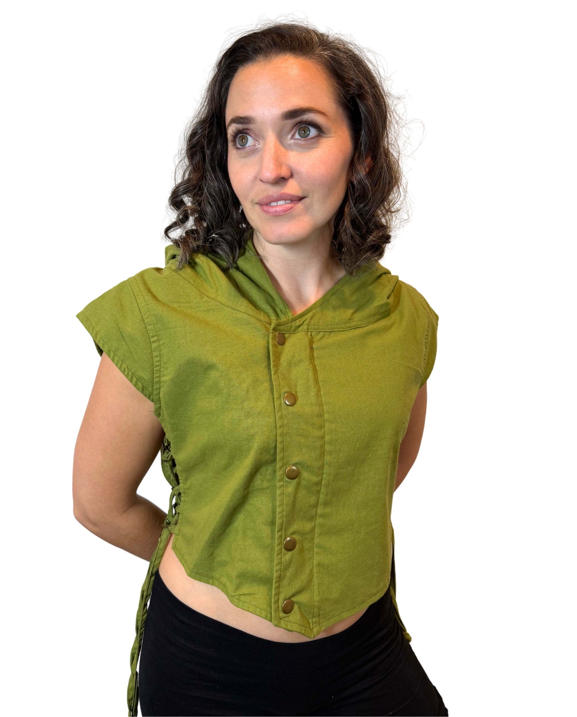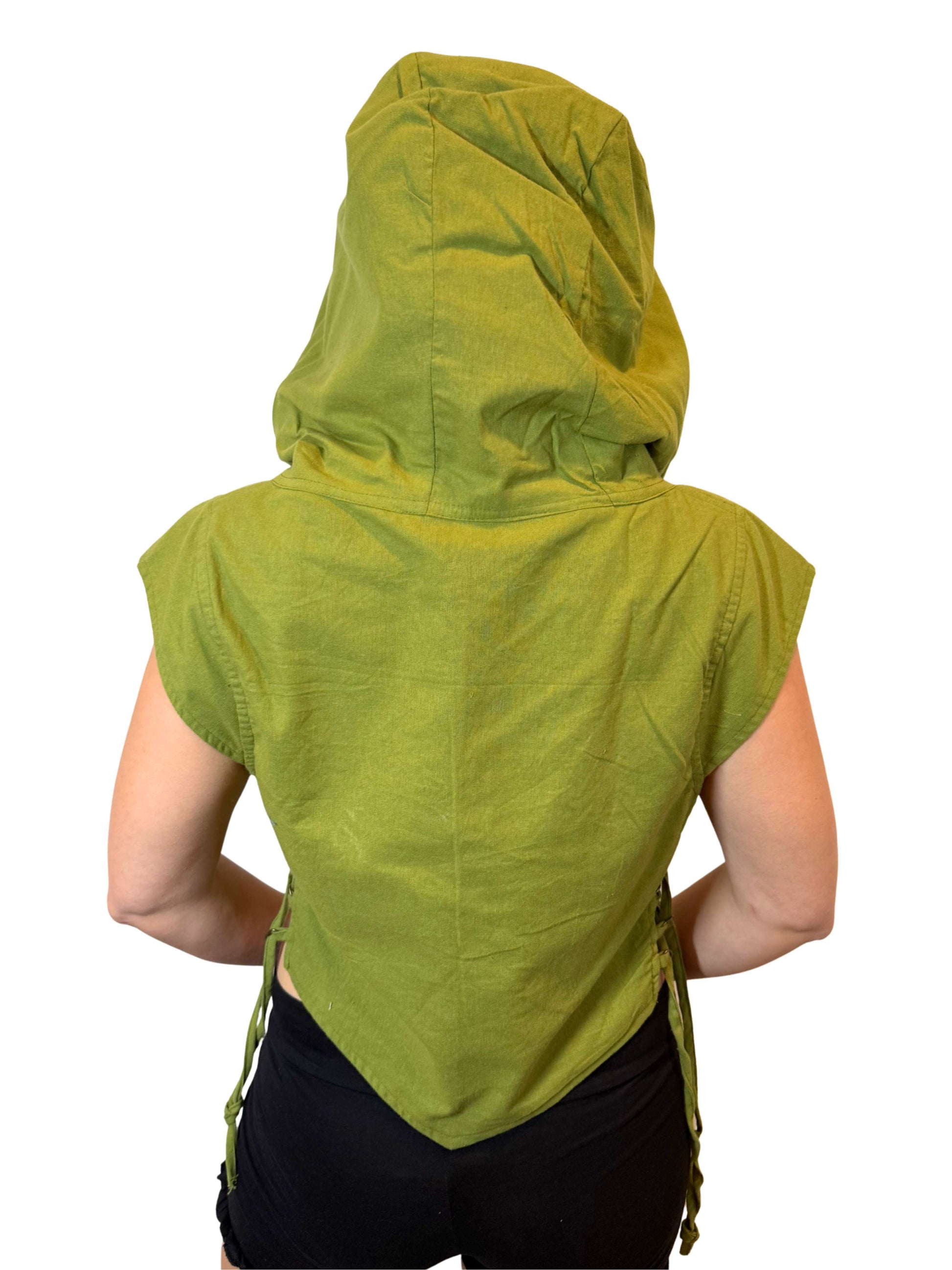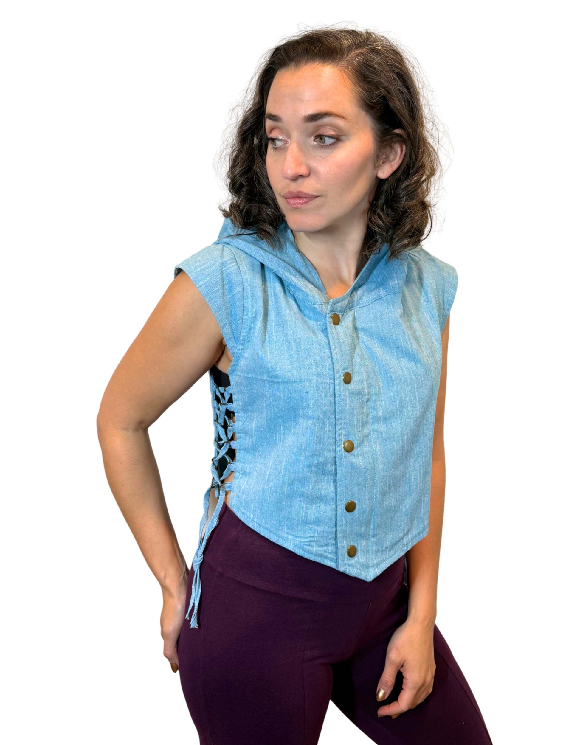Androgynous Cropped Vest with Hood – Cotton Loop Net, Brass Snaps, and Zipper – Stylish, Unique, and Recycled
