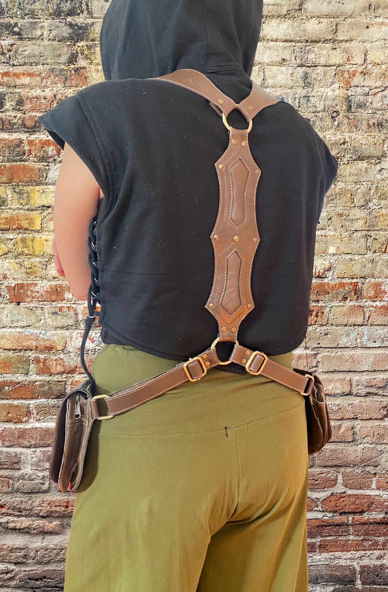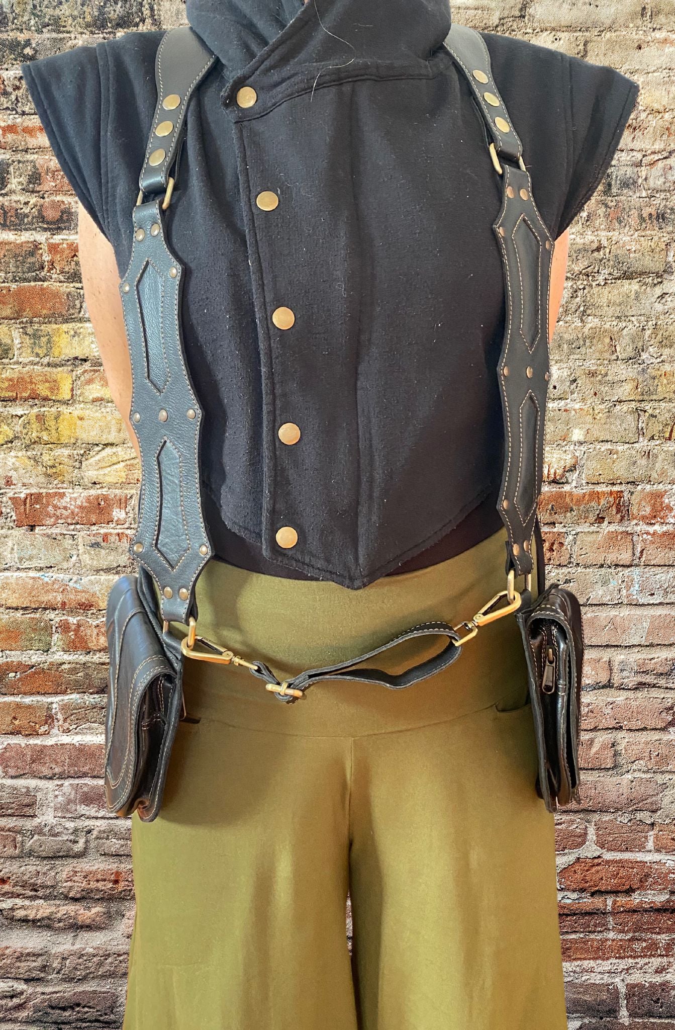 This leather holster adapts to your every need. Each strap is adjustable, allowing it to be used over costumes or under jackets. Zippered pockets on both the inside and out keep your gears and gadgets organized and easily accessible.