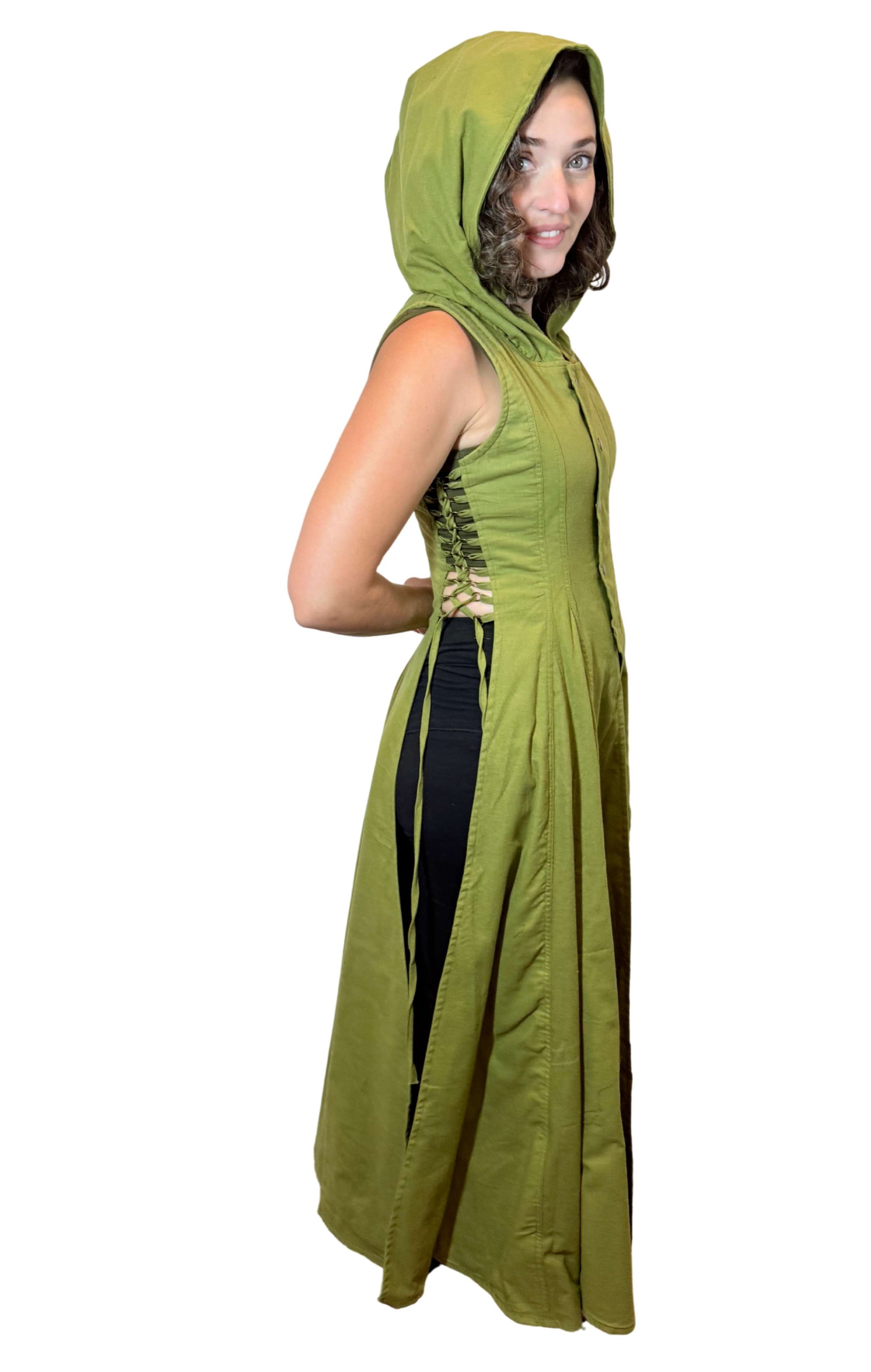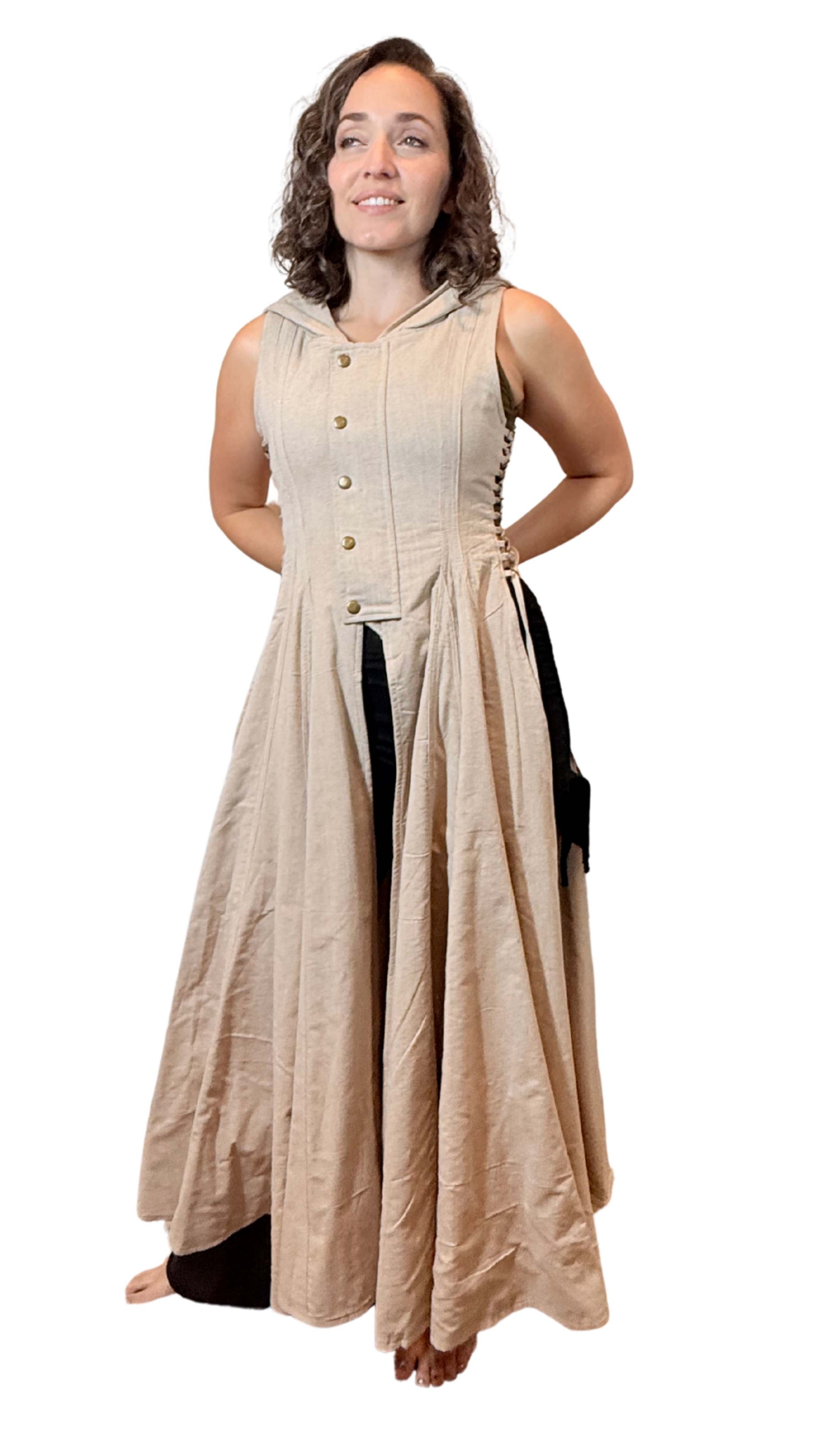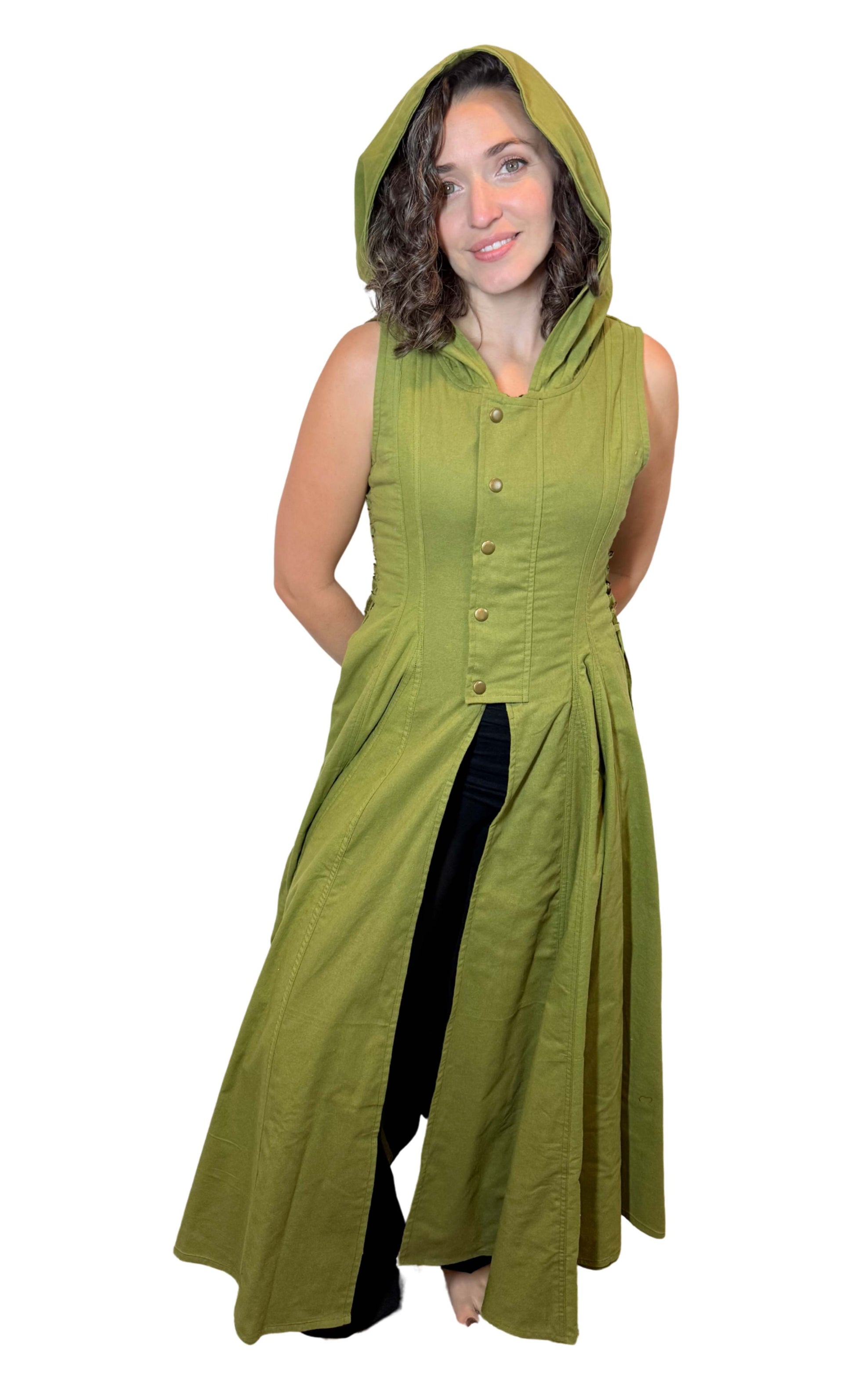 Hooded Cotton Wrap Vest with Side Openings – Brass Button & Zipper Closure | Medieval Festival Vest | Renaissance & Fantasy Layering Top