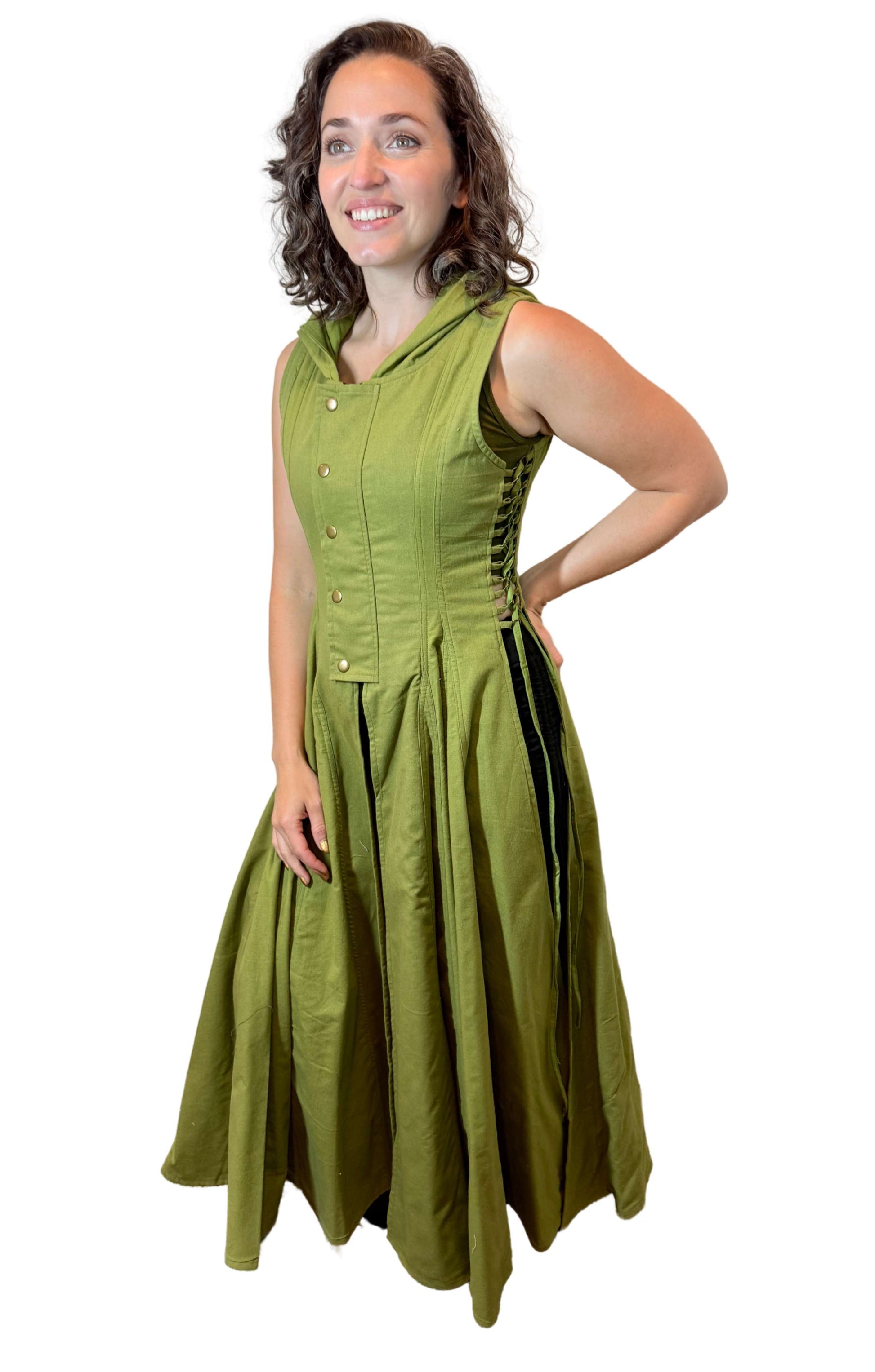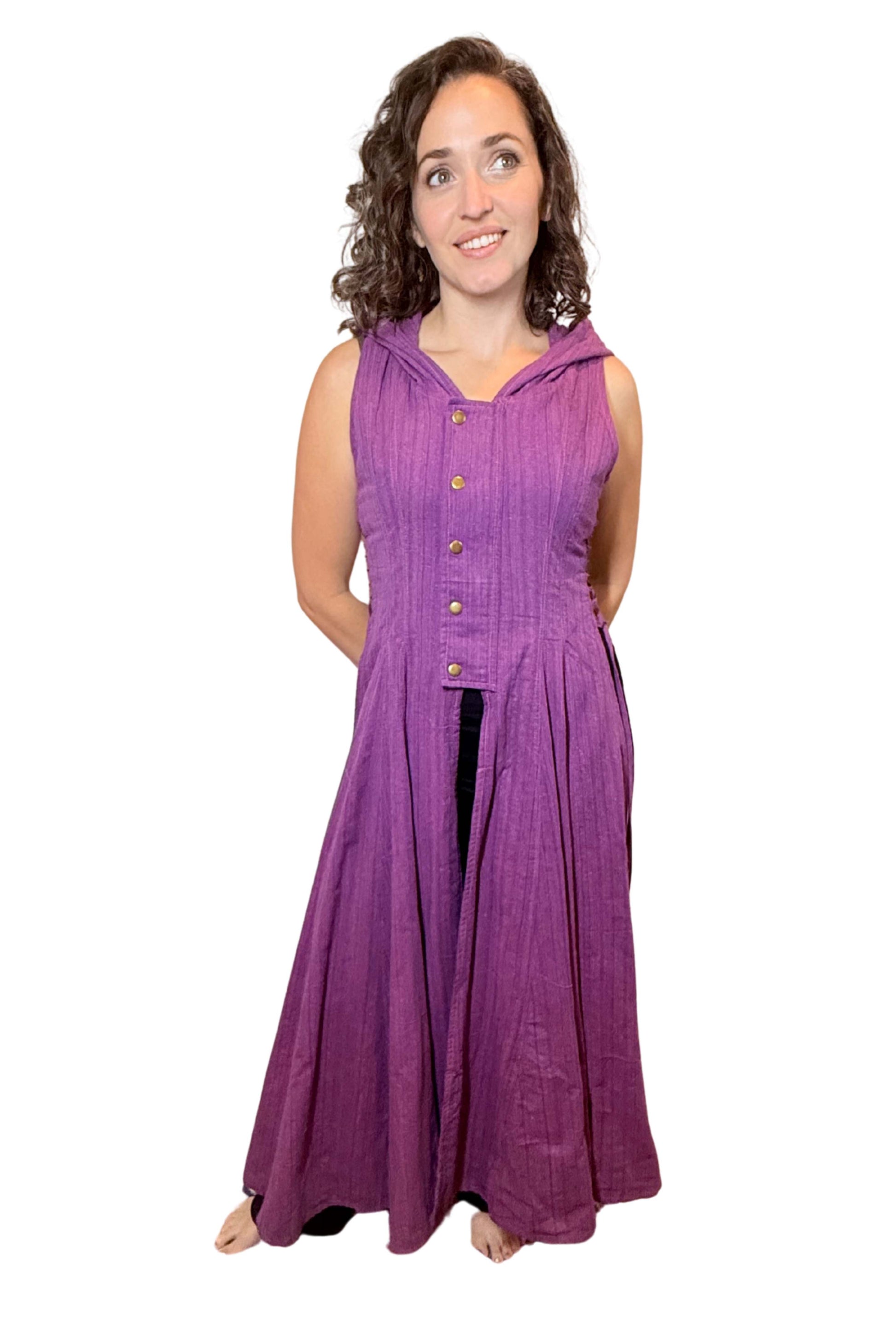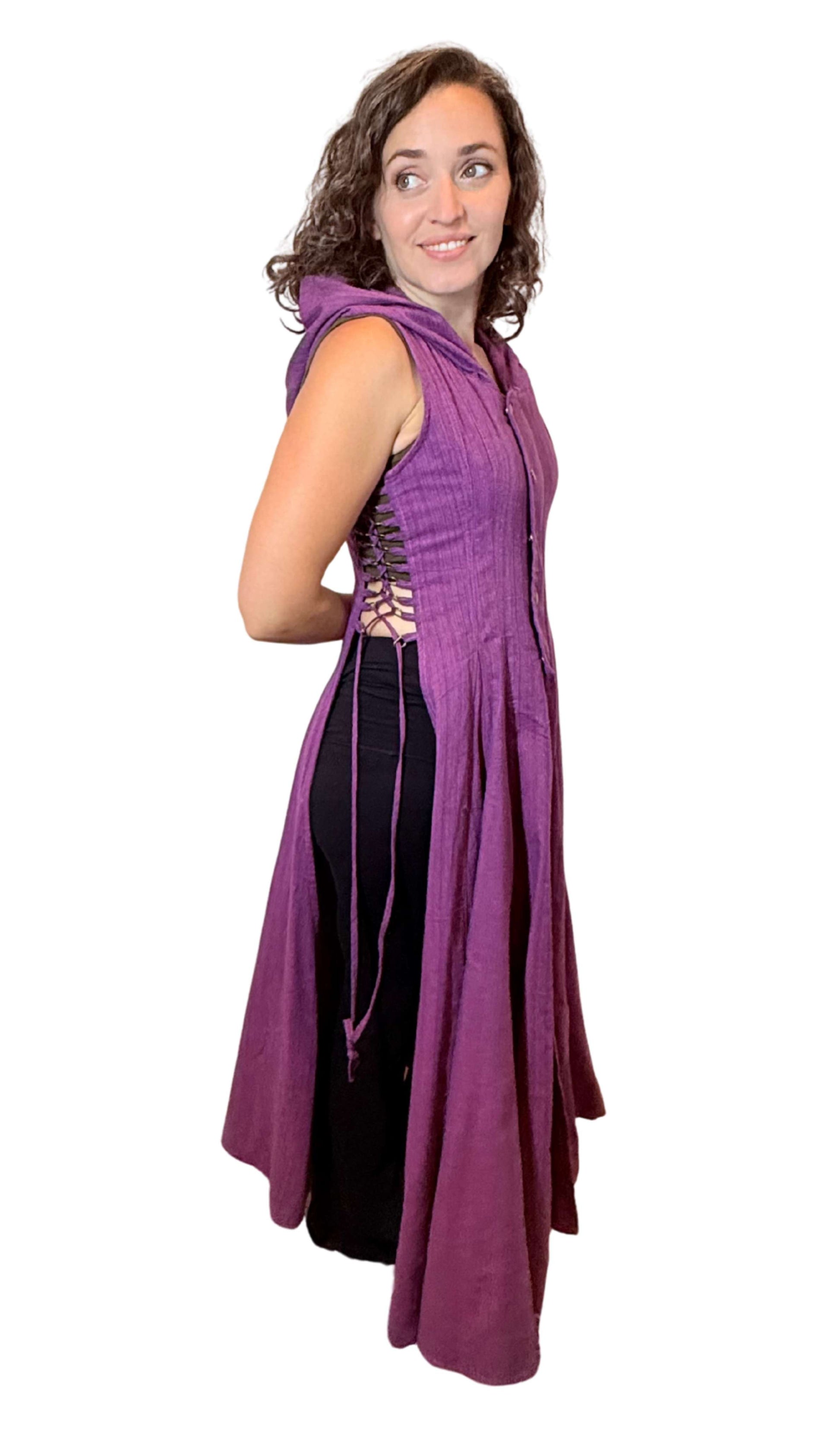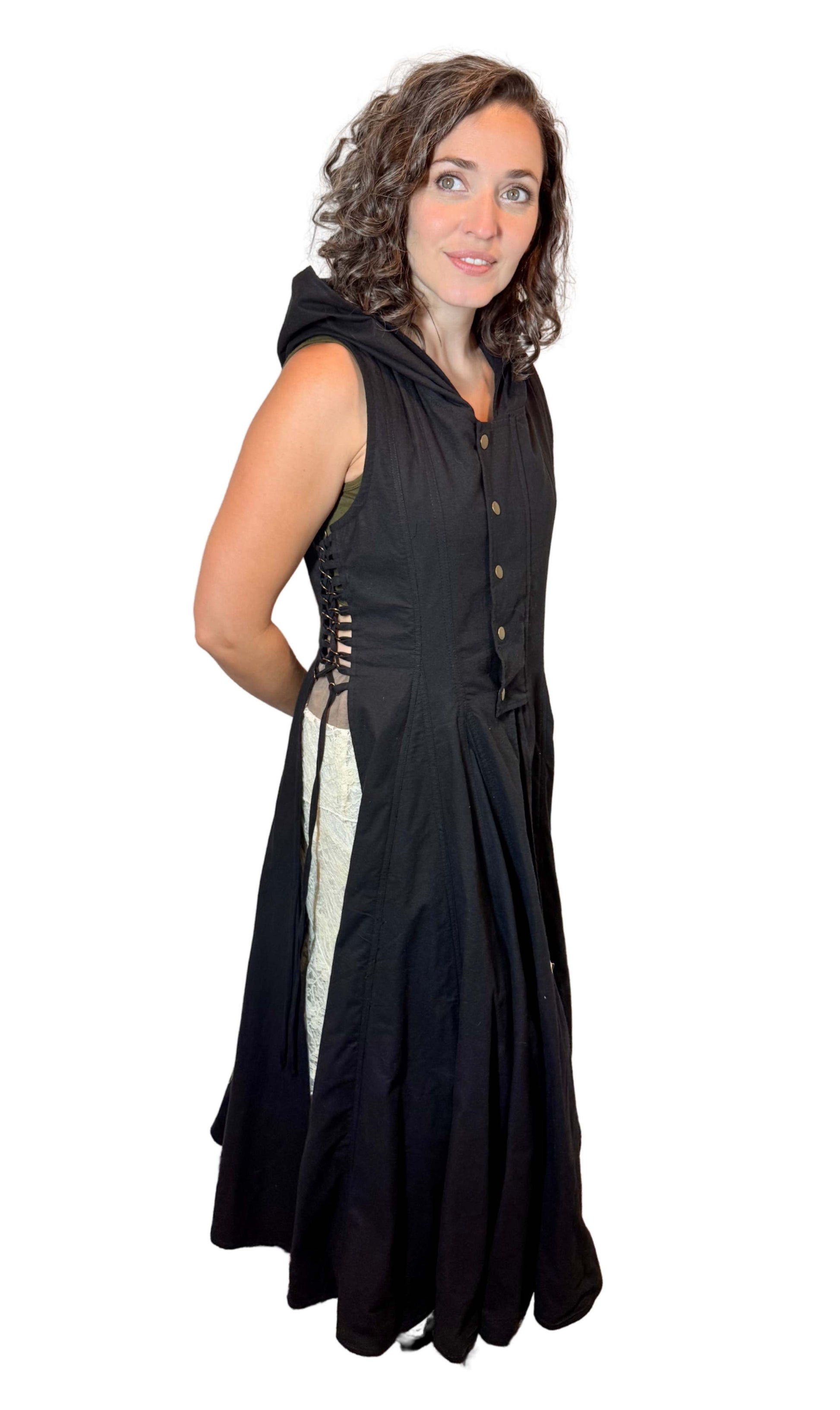 Hooded Cotton Wrap Vest with Side Openings – Brass Button & Zipper Closure | Medieval Festival Vest | Renaissance & Fantasy Layering Top