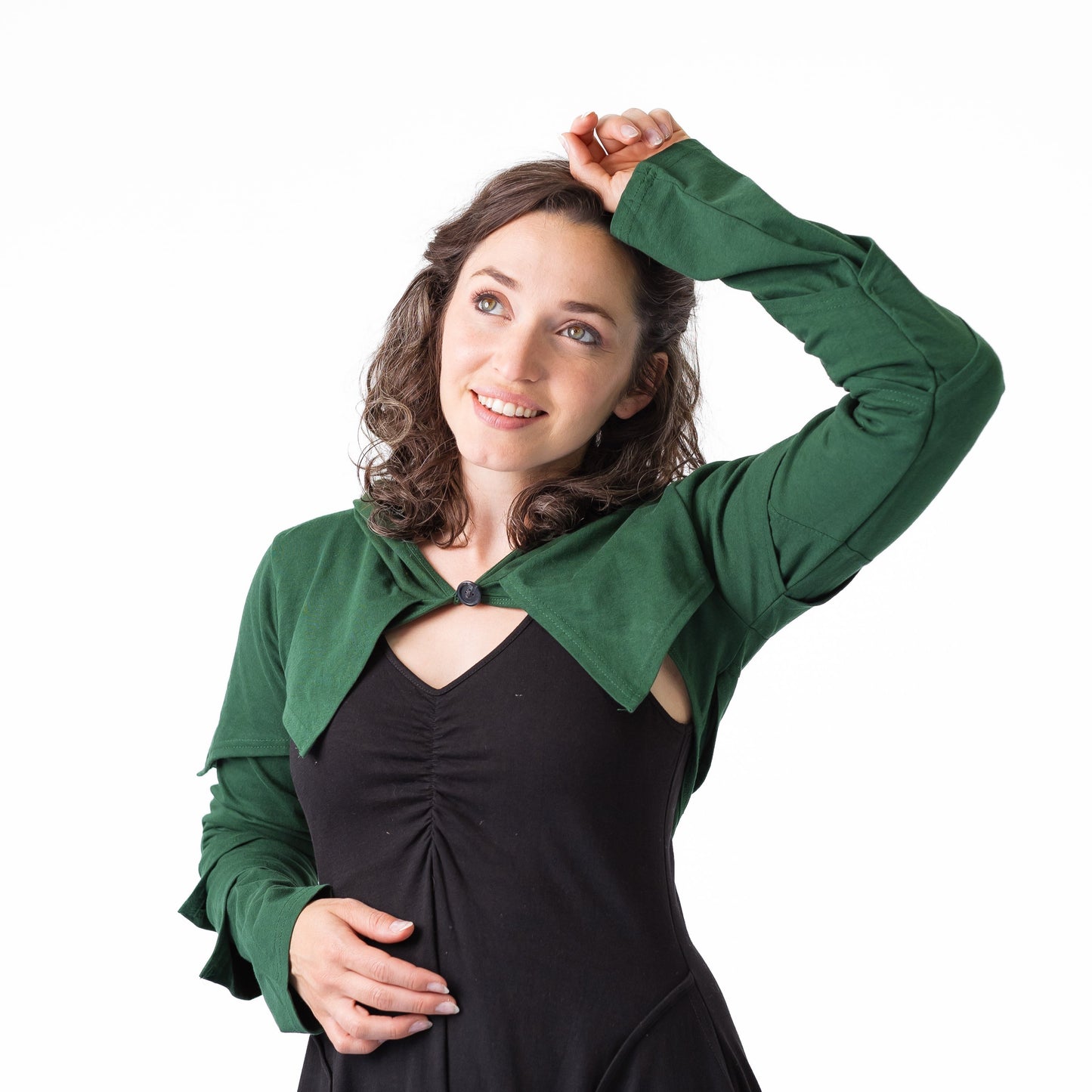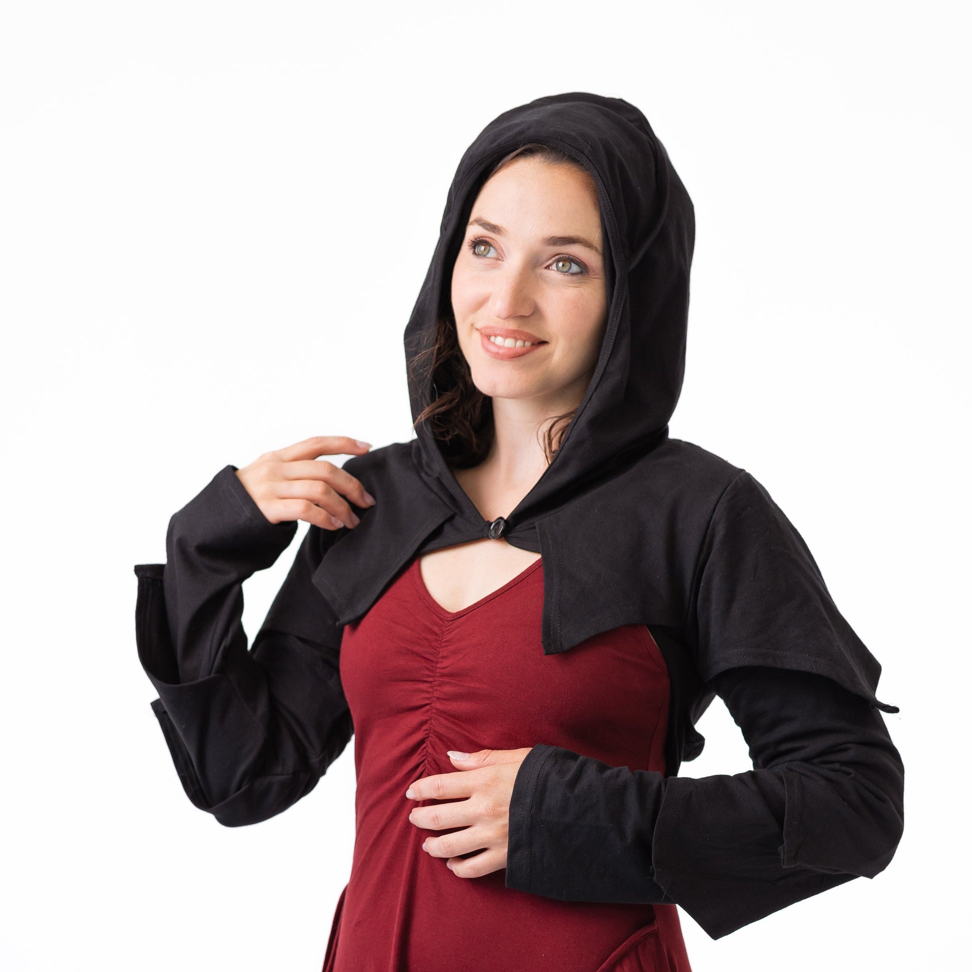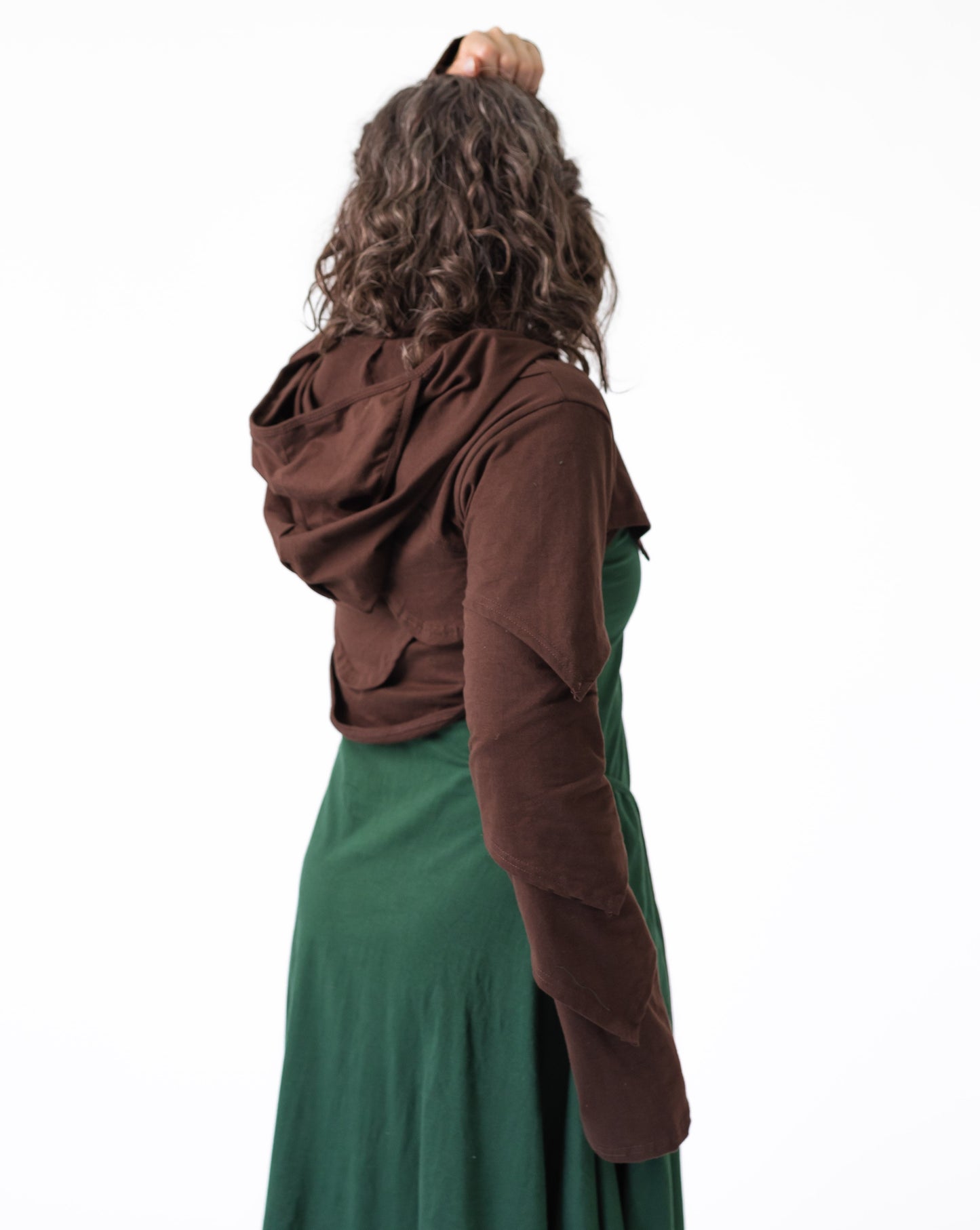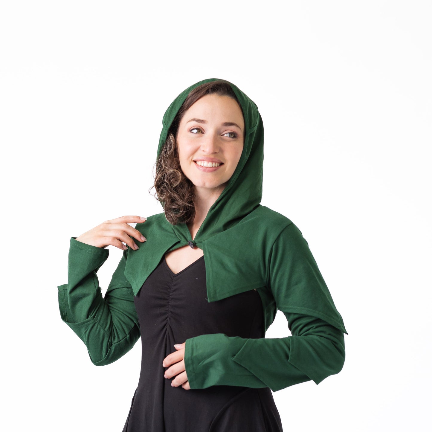Add a touch of warmth and woodland magic to any outfit with this stretchy pixie shrug. Made from a soft and comfortable cotton-blend stretch fabric, this shrug is perfect for layering over dresses, tunics, or festival wear.