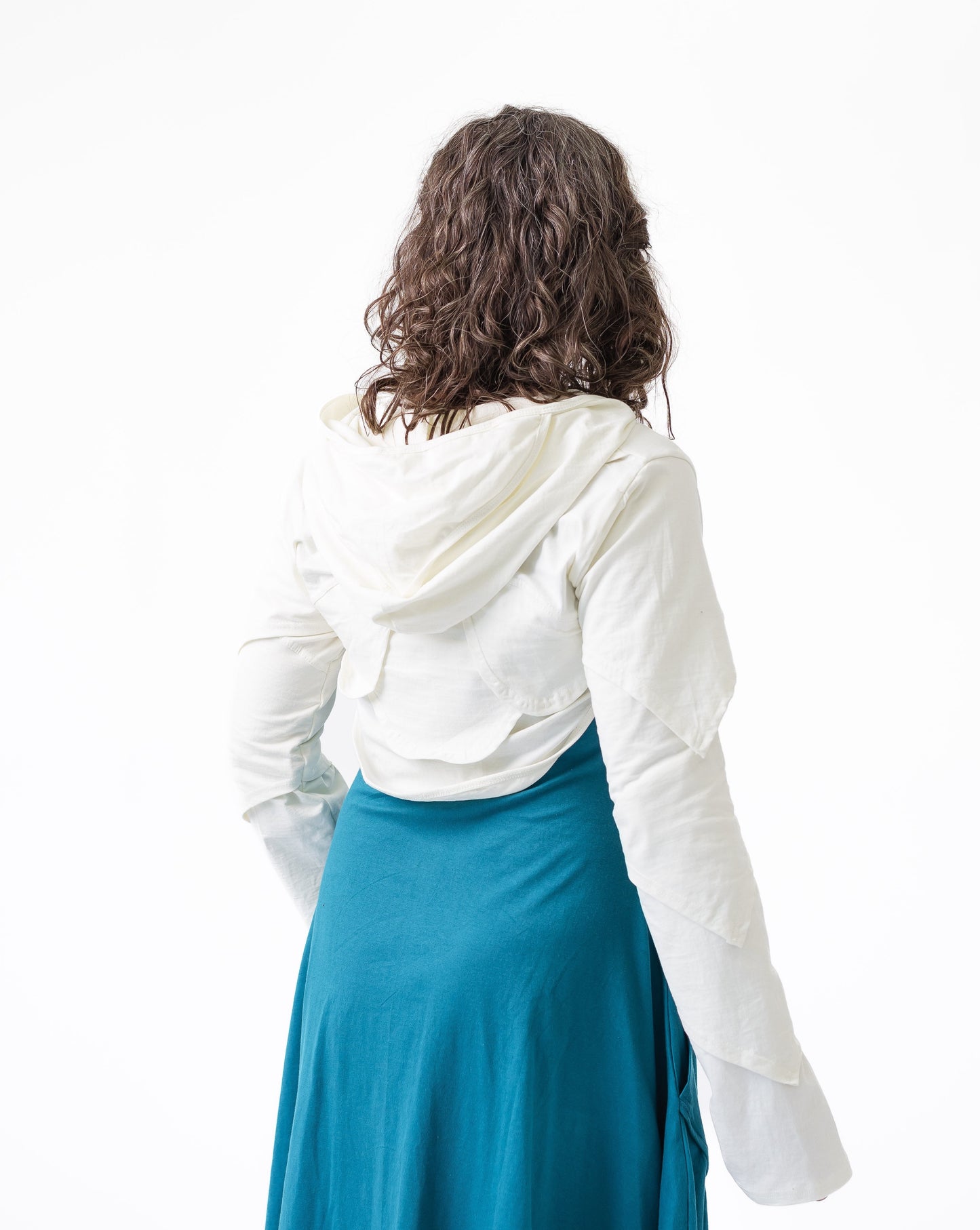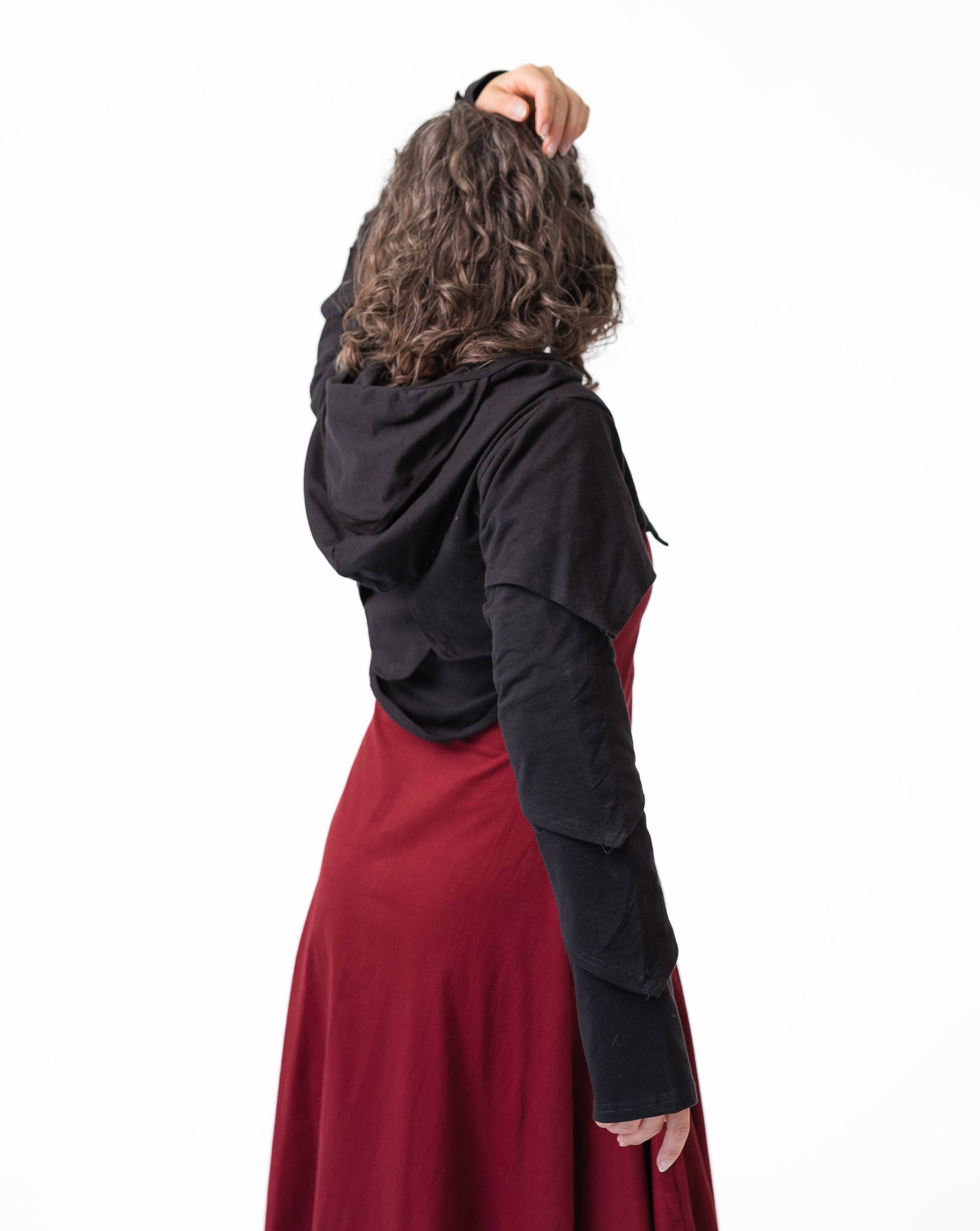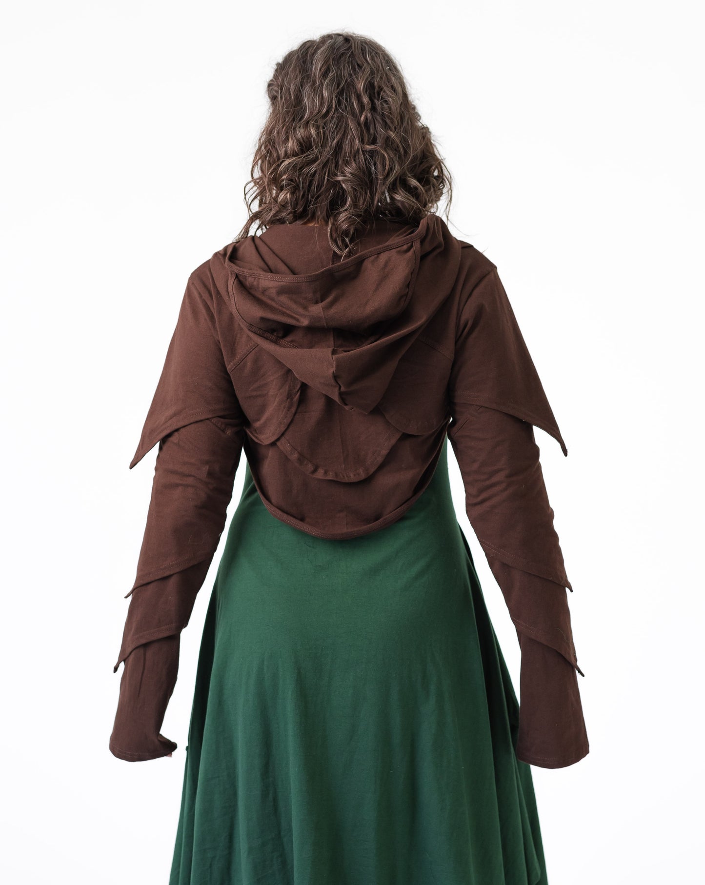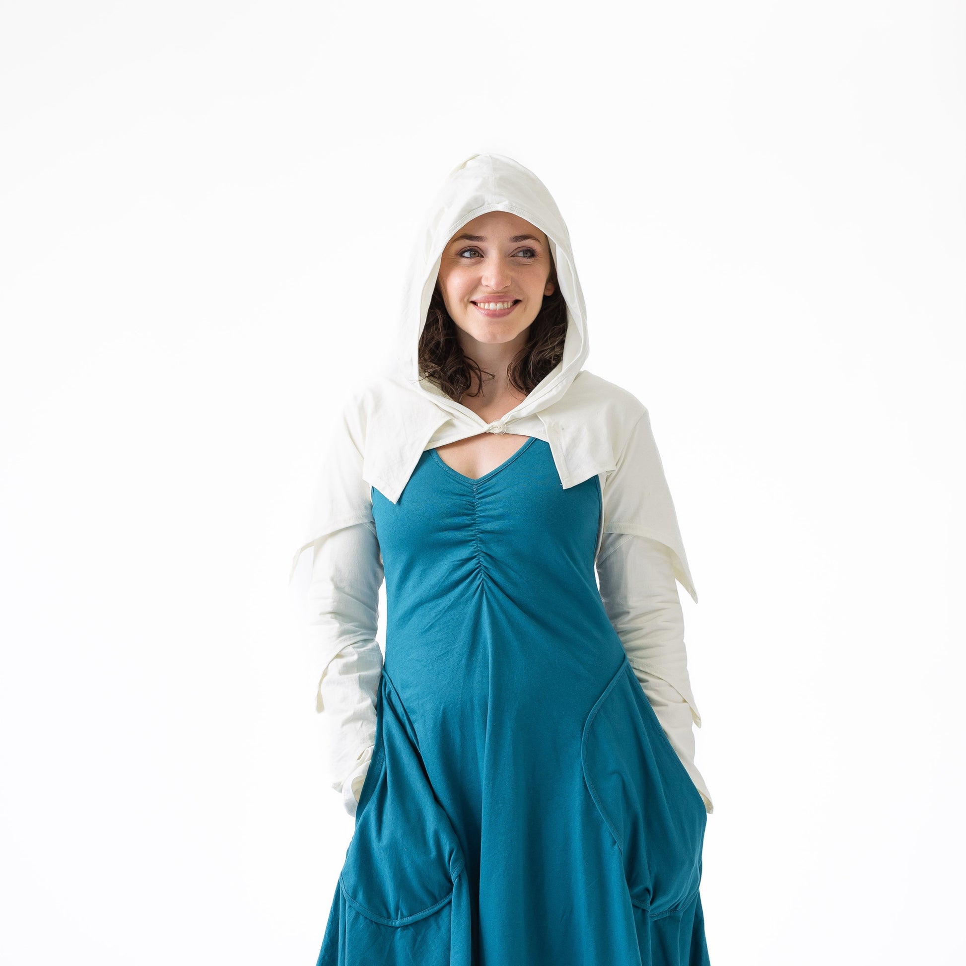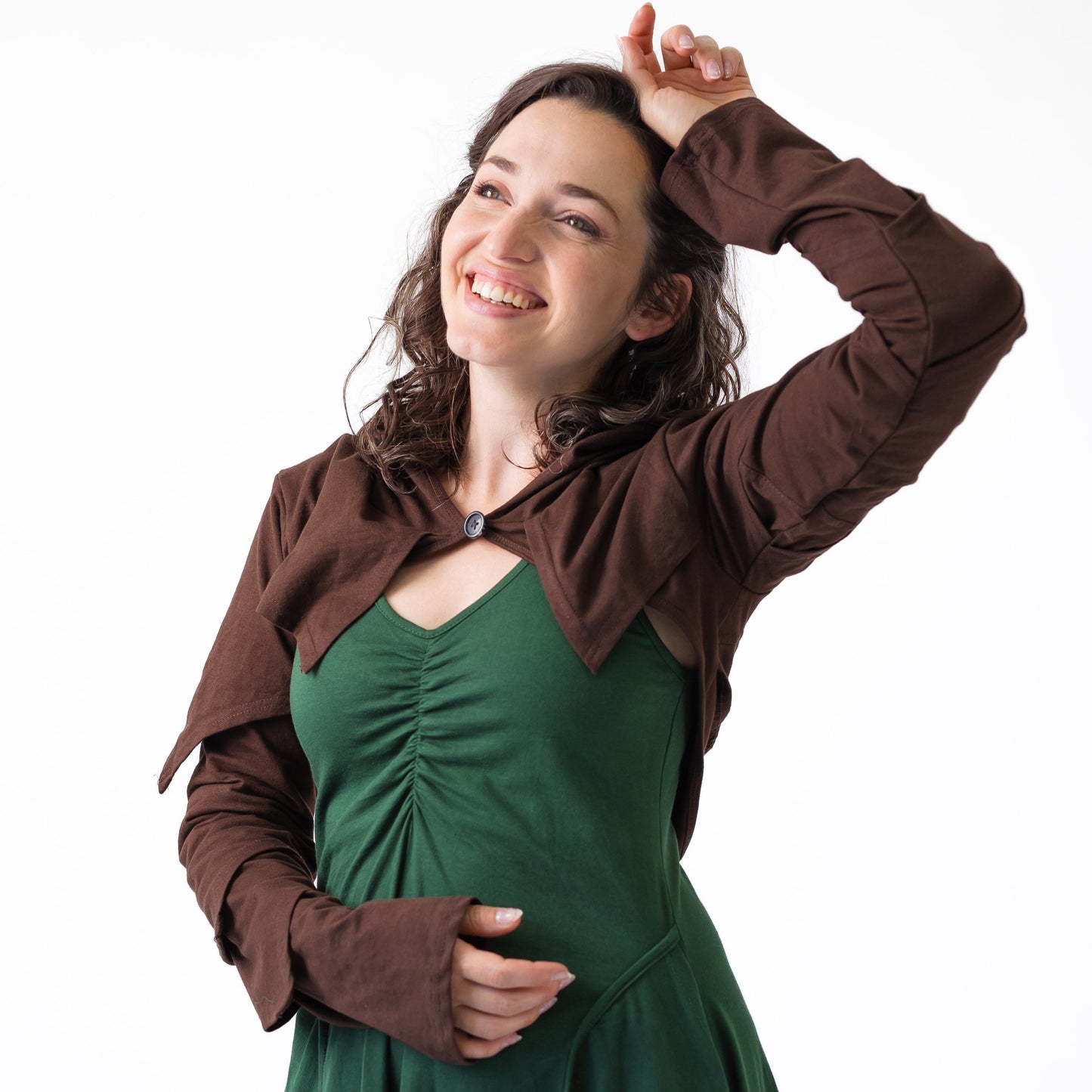 Add a touch of warmth and woodland magic to any outfit with this stretchy pixie shrug. Made from a soft and comfortable cotton-blend stretch fabric, this shrug is perfect for layering over dresses, tunics, or festival wear.