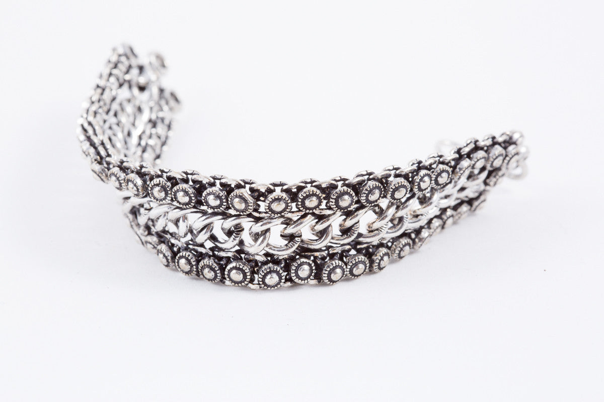 Tribal bracelet with chain detail, hook and clasp closure, in a metal alloy.