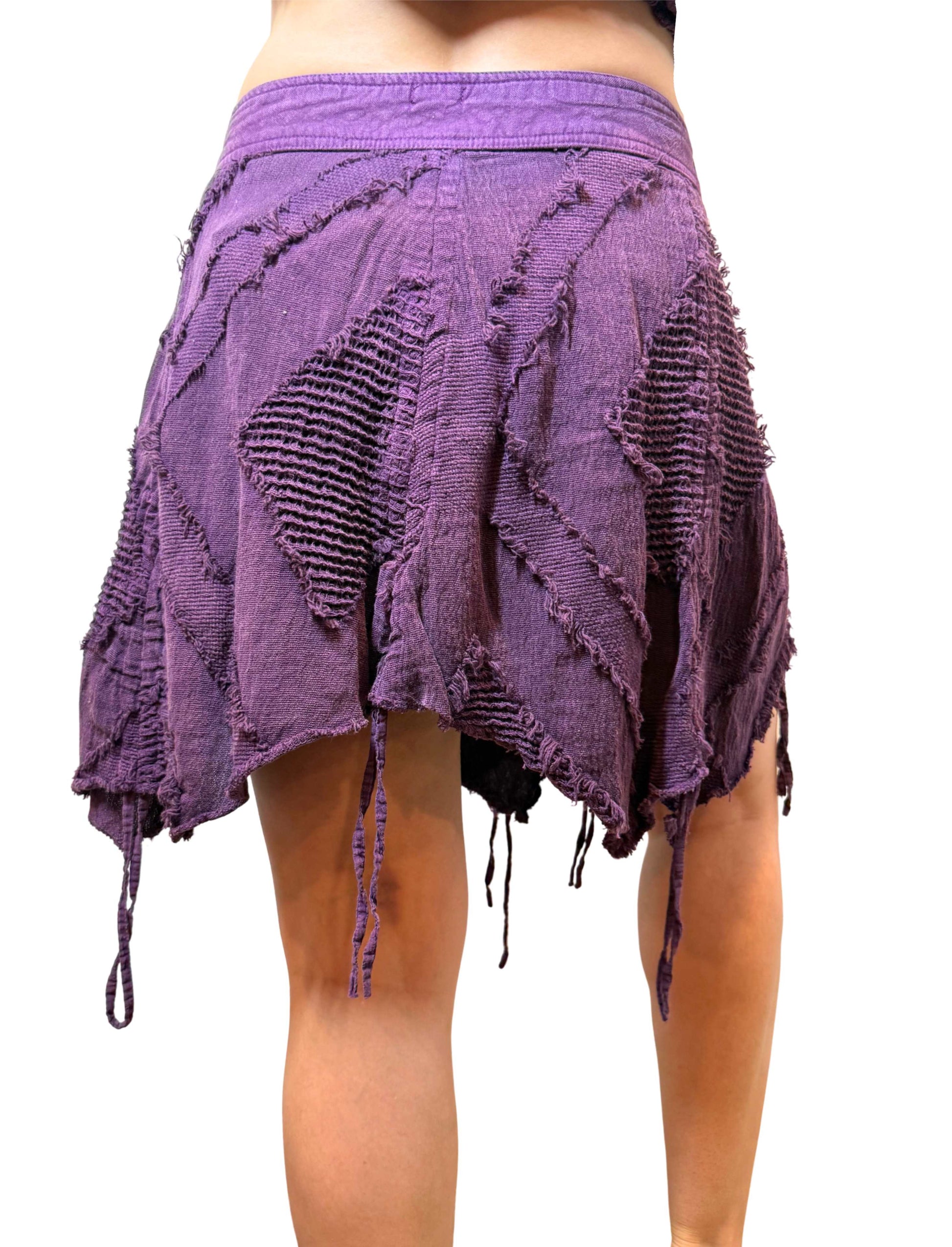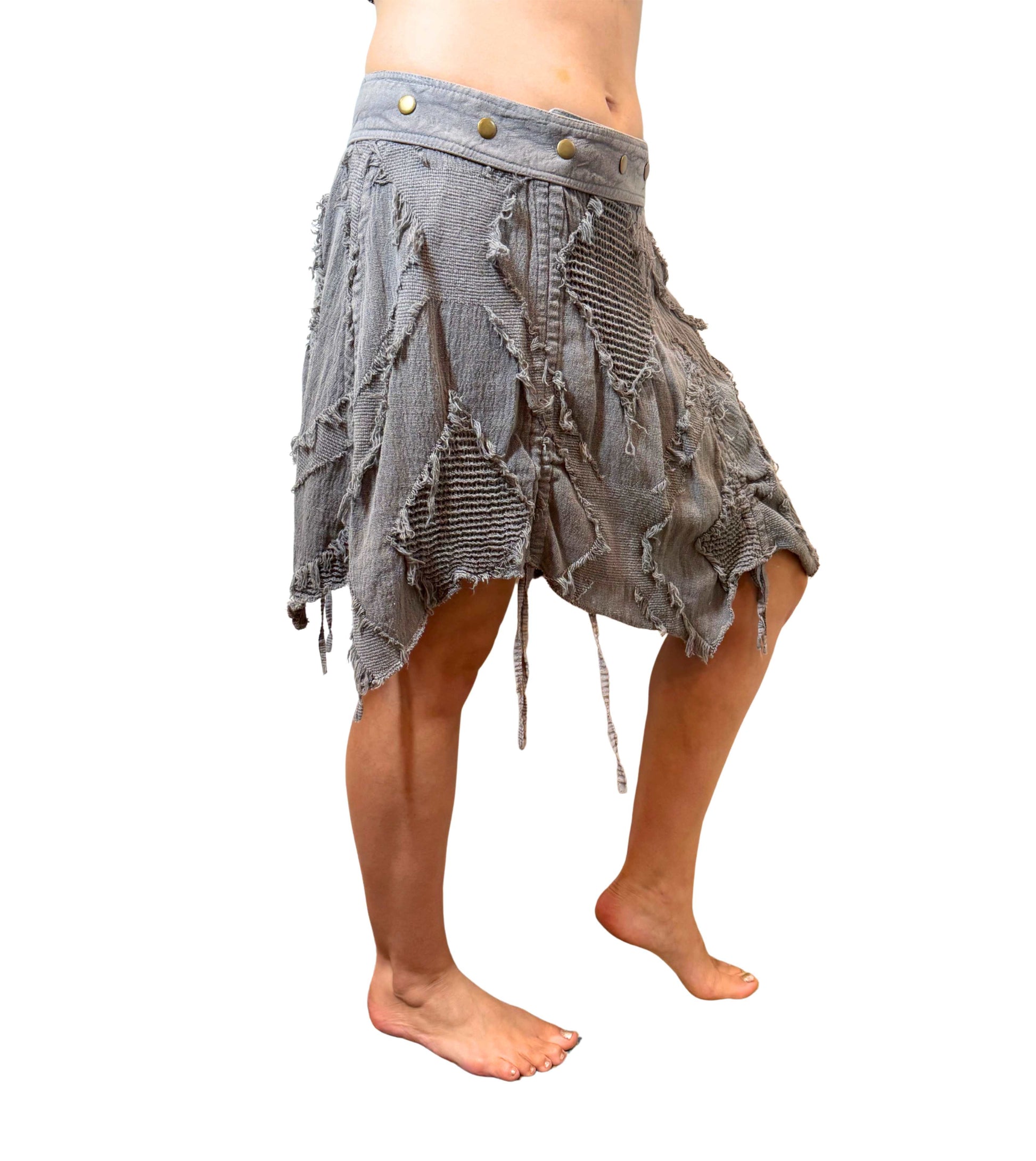 Distressed Stonewashed Jagged Edge Mini Skirt – Adjustable Snap Wrap Skirt with Multiple Ruching Ties | Festival, Punk, Fairy, Pirate Layering Skirt