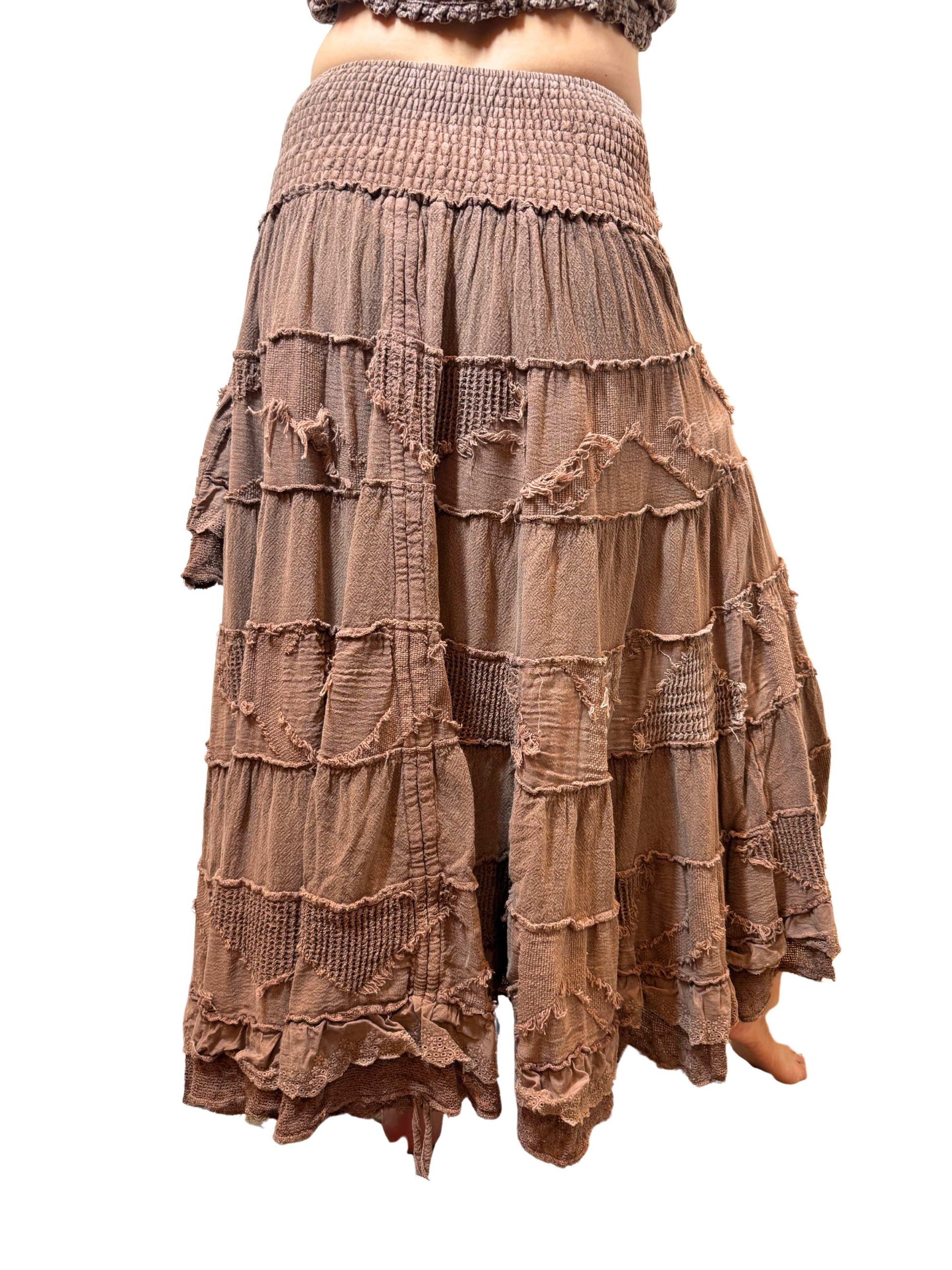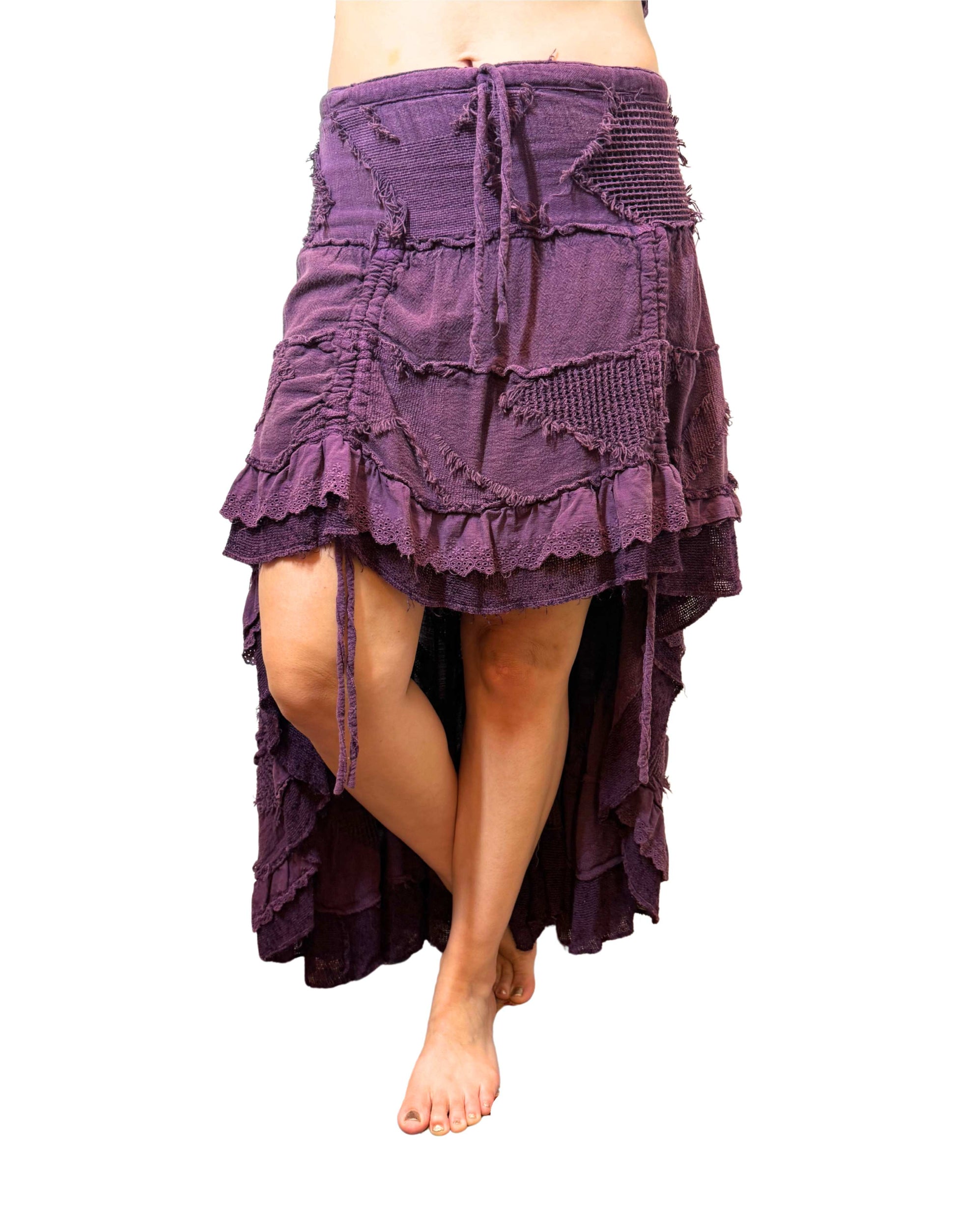 This asymmetrical high-low skirt is the perfect blend of pirate edge, fairy whimsy, and grunge vibe. Made from distressed stonewashed cotton with a soft cotton lace ruffle trim, it brings texture and character to any outfit.